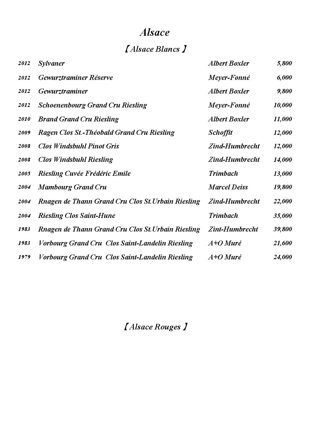 2011年5月・オンリスト アルザスリストに追加しました。 2008アルザス・グラン・クリュ・シュロスベルグ・リースリング/アルベール・マン¥11,000 2007エンゲンガルテン/マルセル・ダイス¥10,500 2004アルザス・グラン・クリュ・ランゲン・ド・タン・クロ・サン・チュルバン・リースリング/ツィント・ウンブレヒト¥17,800 2004クロ・ヴィンズビュール・ゲヴルツトラミネール/ツィント・ウンブレヒト¥12,000