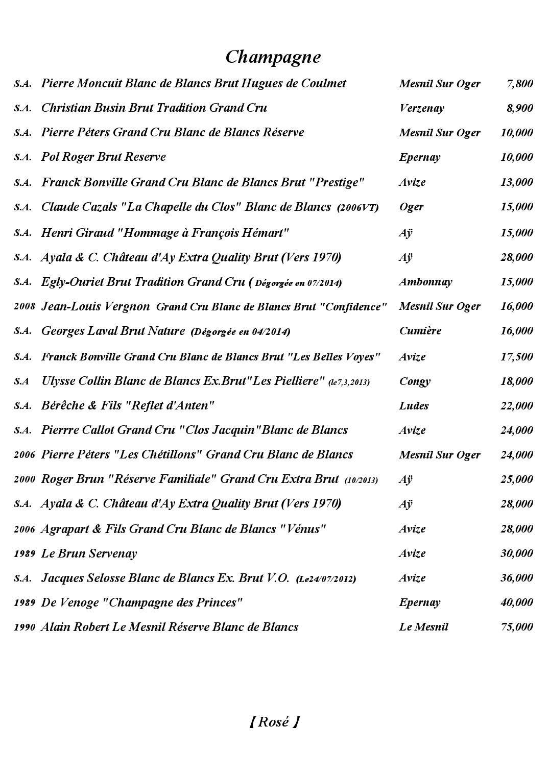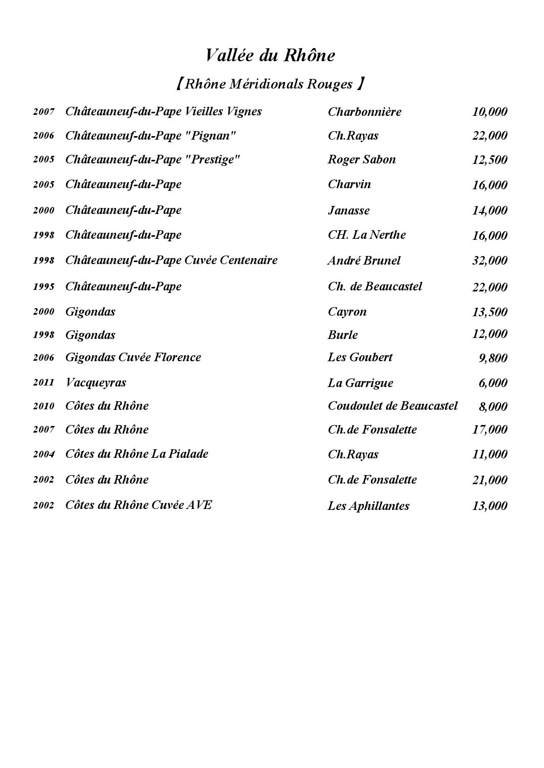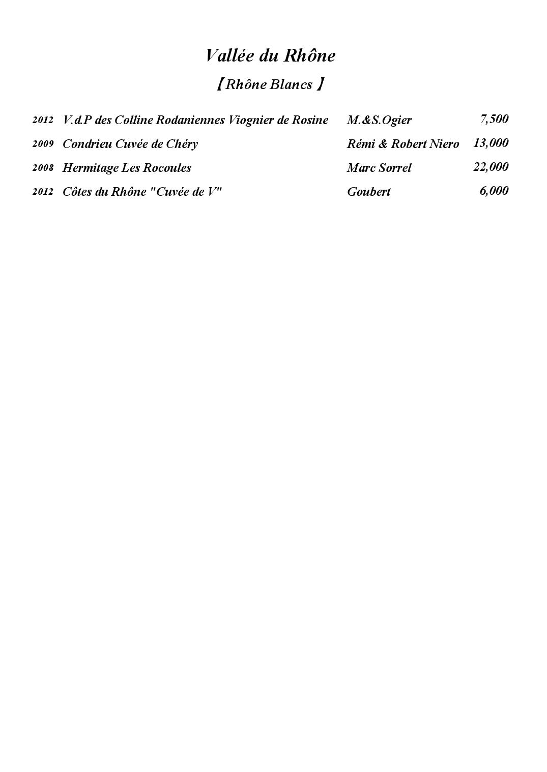 <シャンパーニュ> 2005フェルナン・ヴォーヴェルサン・GC・EXブリュット・ブラン・ド・ブラン/オジェ¥12,600 2004ピエール・モンキュイ・″ニコラ・モンキュイ″・GC・ブラン・ド・ブラン¥17,500 S.A.ピエール・カロ″クロ・ジャカン″/アヴィズ¥21,000 <ブルゴーニュ・白> 1982シャサーニュ・モンラッシェ/フェルナン・ショーヴ¥29,800 2004モンテリー・レ・シャン・フリオ/ルーロ¥13,650 2010コルトン・シャルルマーニュ/デュブレール¥25,000 2011シャサーニュ・モンラッシェ・モルジョ/シャントリーヴ¥14,700 <ブルゴーニュ・赤> 1971ヴォルネイ・クロ・ド・ラ・ブス・ドール/プス・ドール¥78,000 1979ポマール・レ・ザリジエール/ルジューヌ¥29,800 1986ポマール・レ・リュジャン/フェリックス・クレルジェ¥24,000 1997シャサーニュ・モンラッシェ・モルジョ/プリュール・ブリュネ¥15,750 2008ボーヌ・ソン・ヴィーニュ/アルベール・モロ¥8,800 <ローヌ>