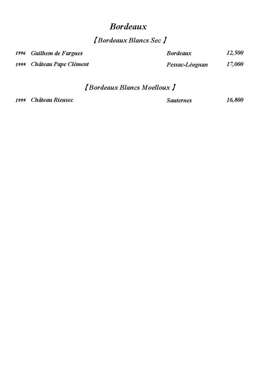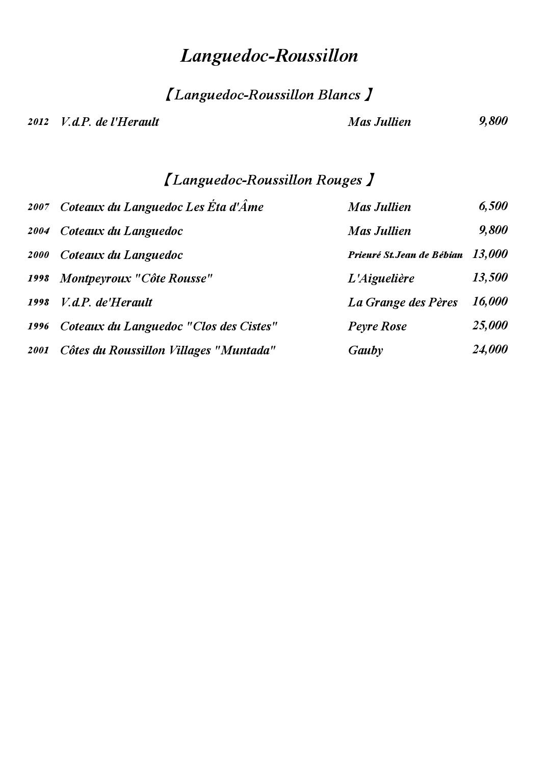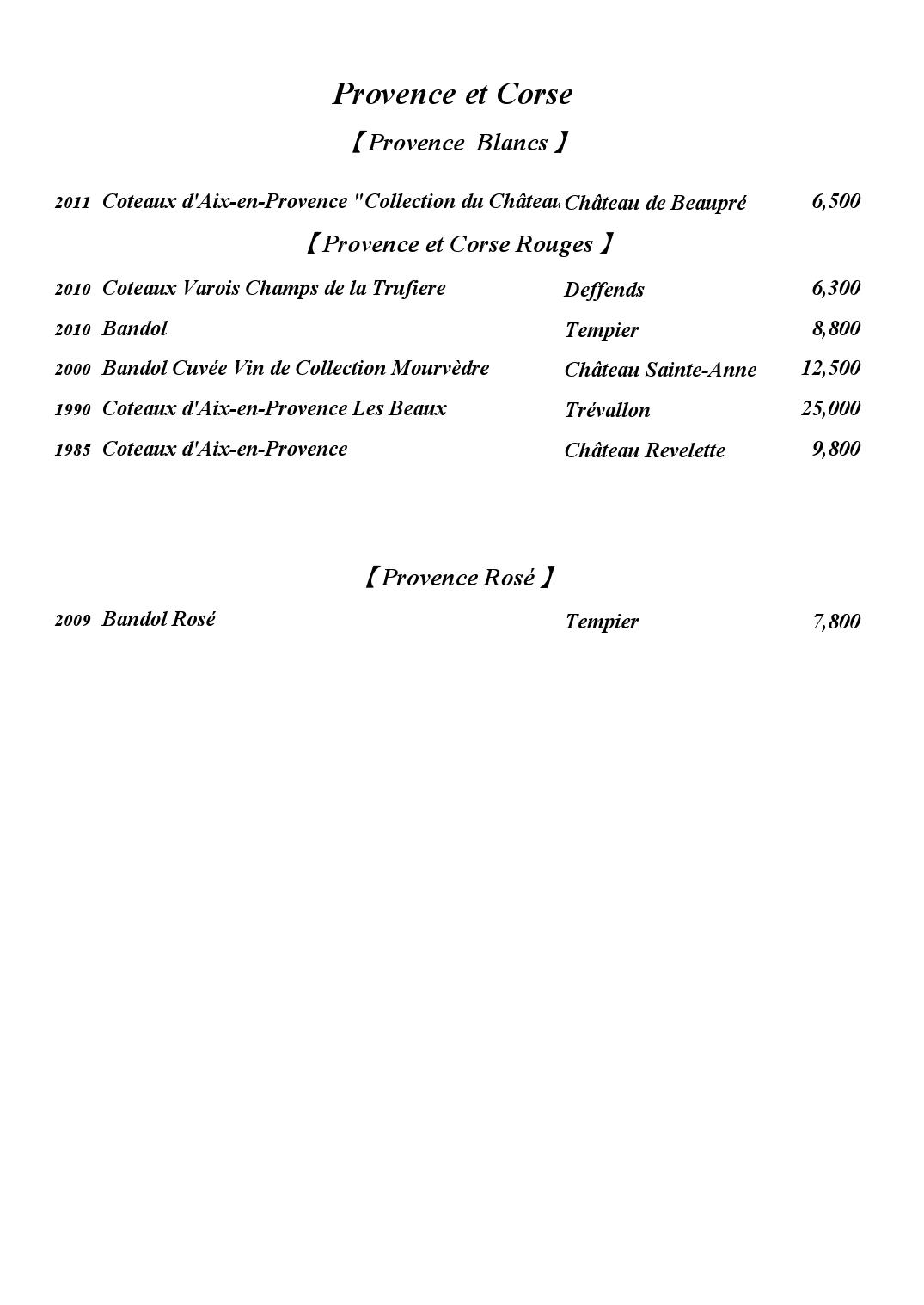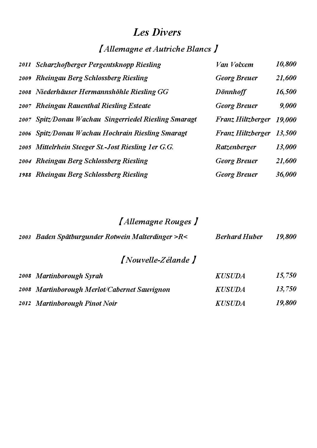 <シャンパーニュ> 2005フェルナン・ヴォーヴェルサン・GC・EXブリュット・ブラン・ド・ブラン/オジェ¥12,600 2004ピエール・モンキュイ・″ニコラ・モンキュイ″・GC・ブラン・ド・ブラン¥17,500 S.A.ピエール・カロ″クロ・ジャカン″/アヴィズ¥21,000 <ブルゴーニュ・白> 1982シャサーニュ・モンラッシェ/フェルナン・ショーヴ¥29,800 2004モンテリー・レ・シャン・フリオ/ルーロ¥13,650 2010コルトン・シャルルマーニュ/デュブレール¥25,000 2011シャサーニュ・モンラッシェ・モルジョ/シャントリーヴ¥14,700 <ブルゴーニュ・赤> 1971ヴォルネイ・クロ・ド・ラ・ブス・ドール/プス・ドール¥78,000 1979ポマール・レ・ザリジエール/ルジューヌ¥29,800 1986ポマール・レ・リュジャン/フェリックス・クレルジェ¥24,000 1997シャサーニュ・モンラッシェ・モルジョ/プリュール・ブリュネ¥15,750 2008ボーヌ・ソン・ヴィーニュ/アルベール・モロ¥8,800 <ローヌ>