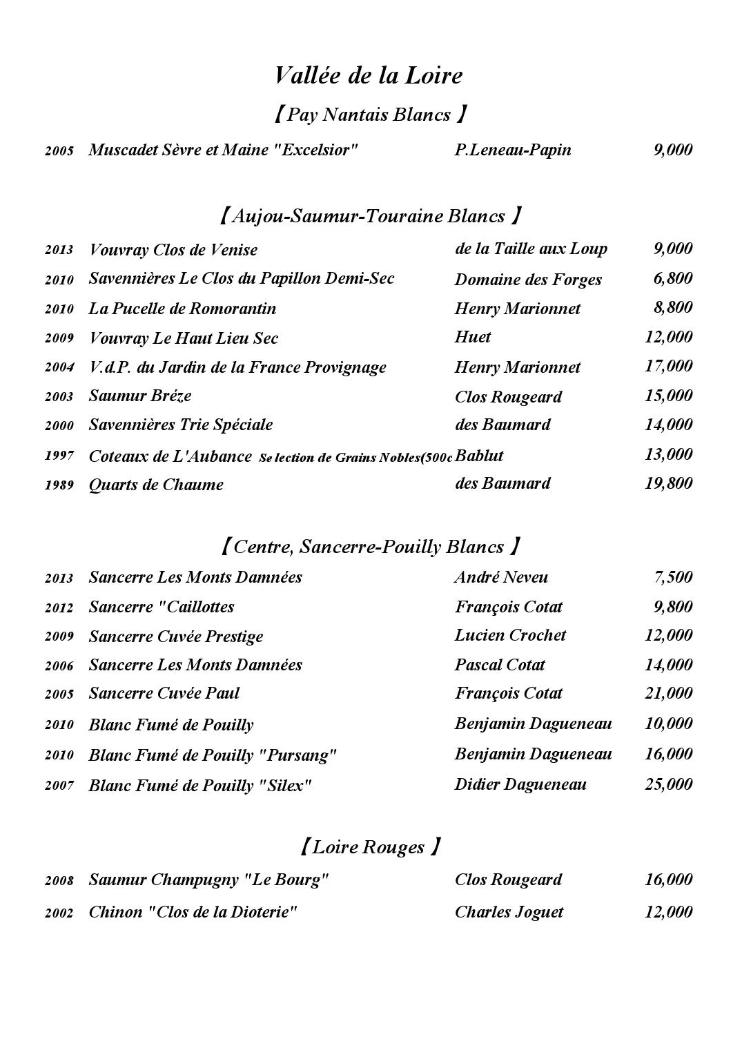 "ラ・シャペル・デュ・クロ"/オジェ¥14500 2007ガストン・シケ・スペシャル・クラブ/ディジィ¥15000 2005ミュスカデ・セーヴル・エ・メーヌ・エクセルシオール/ピエール・ルノー・パパン¥9000 2009サンセール・キュヴェ・プレスティージュ/リュシャン・クロシェ¥12000 2008ソミュール・シャンピニィ・ル・ブール/クロ・ルジャール¥16000
