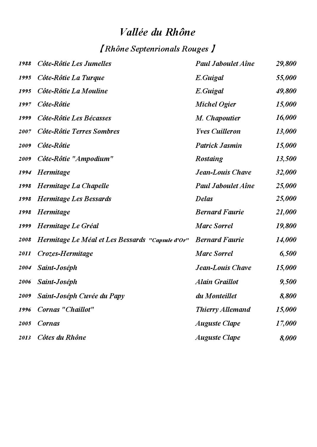 2006コート・ロティ/ミッシェル&ステファン・オジェ¥13,650 1998エルミタージュ・ラ・シャペル/ポール・ジャブレ・エネ¥21,000 1998エルミタージュ・レ・ベサール/ドラス¥29,800 2011クローズ・エルミタージュ・キュヴェ・パルティキュイエール/ルミジエール¥6,300 1994コルナス/ノエル・ヴェルセ¥24,000 1997コート・ロティ/ミッシェル・オジェ¥18,900 1980シャトーヌフ・デュ・パプ/クロ・デュ・モン・トリヴェ¥22,000