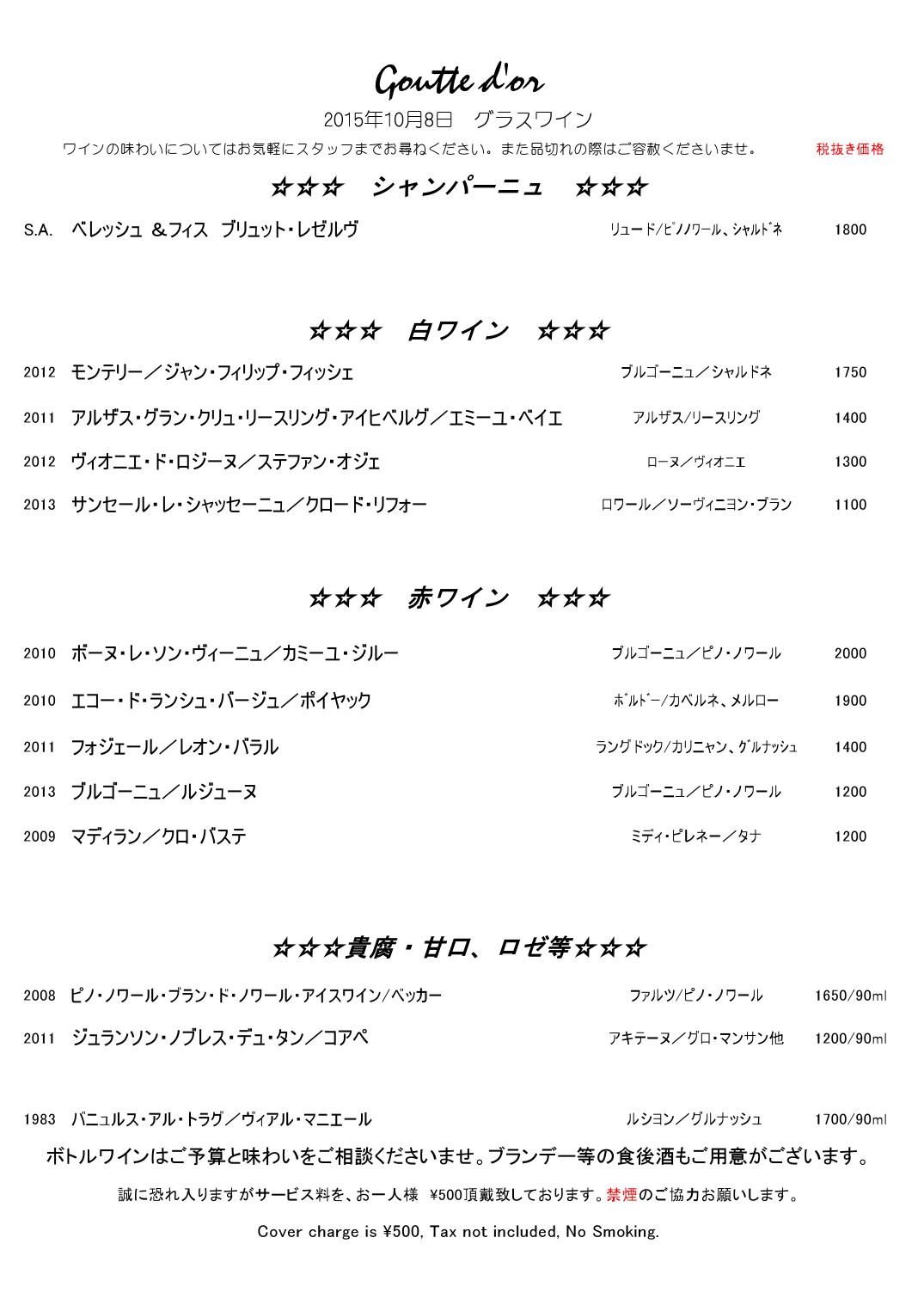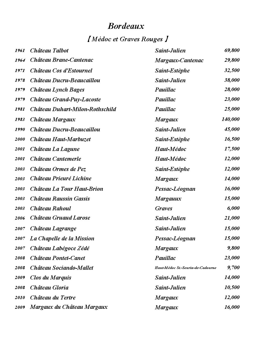 2015年3月オンリスト情報 1986シャトー・ラトゥール・ア・ポムロール/ポムロール¥36000 2006シャトー・スタール/サン・テミリオン¥12500 2007シャトー・ランクロ/ポムロール¥10800 2003シャトー・ローザン・ガシー/マルゴー¥15000 2006シャトー・グリュオー・ラローズ/サン・ジュリアン¥21000 2009シャトー・ラコスト・ボリーポイヤック¥10800 1995バタール・モンラッシェ/アンリ・クレール¥50000 2007コルトン・シャルルマーニュ/ヴァンサン・ジラルダン¥24000 2007ピュリニー・モンラッシェ・レ・ペリエール/ルイ・カリヨン¥24000 1974モレ・サン・ドニ/ドルーアン・ラローズ¥25000 1976シャルム・シャンベルタン/セラファン¥59800 1990ヴォーヌ・ロマネ/ベルナール・リオン¥16000 1993ニュイ・サン・ジョルジュ・レ・シェニョ/ロベール・シュヴィヨン¥37000 1997シャペル・シャンベルタン/ポンソ¥49800 1997ジュヴレ・シャンベルタン・VV /ジャンテ・パンシオ¥18900 2006ニュイ・サン・ジョルジュ・クロ・デ・ザリジリエール/パトリス・リオン¥14000 2007シャンボール・ミュジニー/アラン・ユドロ・ノエラ¥15000