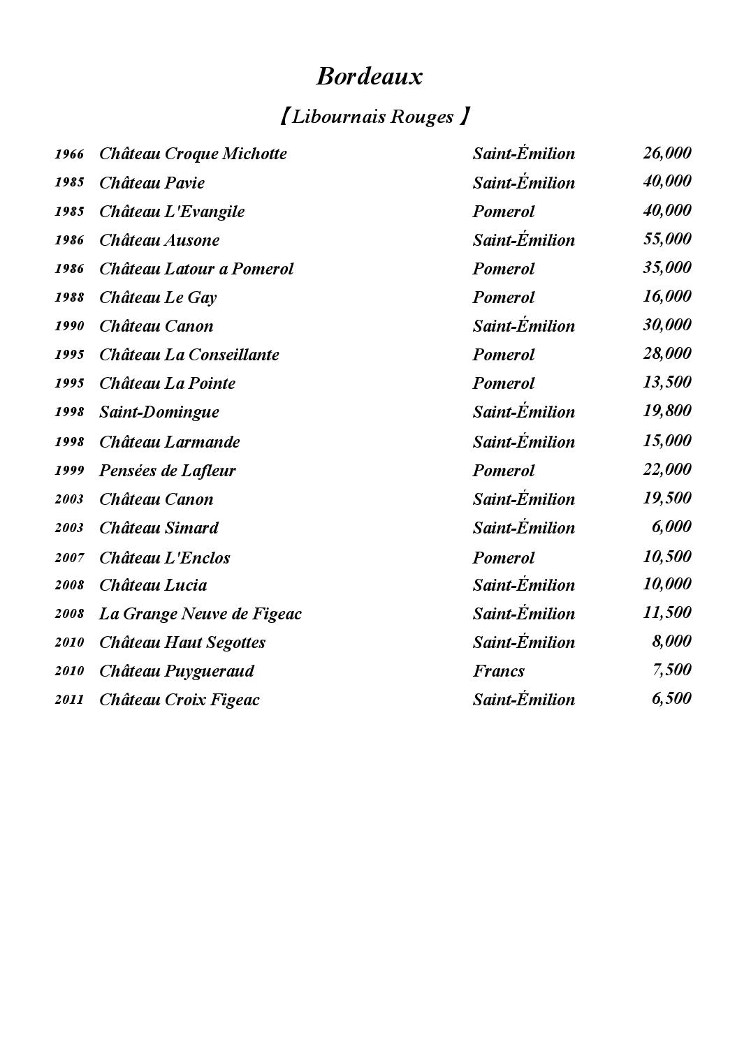 ”レスプリ・ド・2002”/メニル・シュル・オジェ¥14000 2003シャトー・シマール/サン・テミリオン¥6000 2008ラ・グランジュ・ヌーヴ・ド・フィジャック/サン・テミリオン¥11500 1999ポマール・ソッシーユ/ミュシィ¥14000 2010ジュヴレ・シャンベルタン・レ・シャンポー/バンジャマン・ルルー¥15000