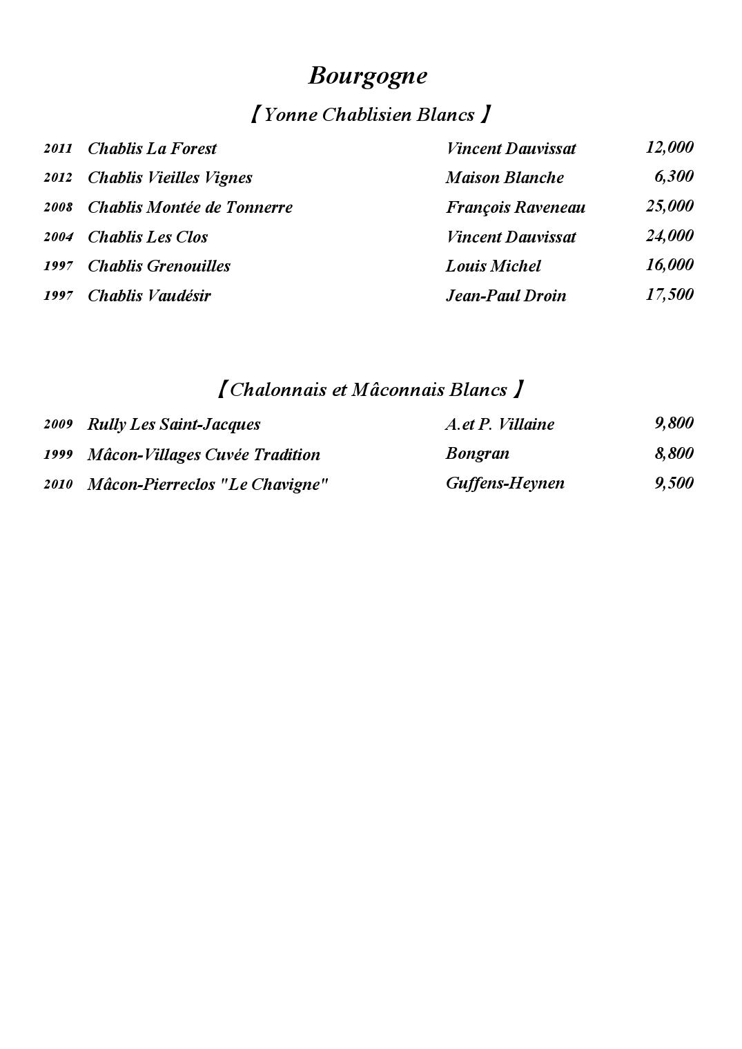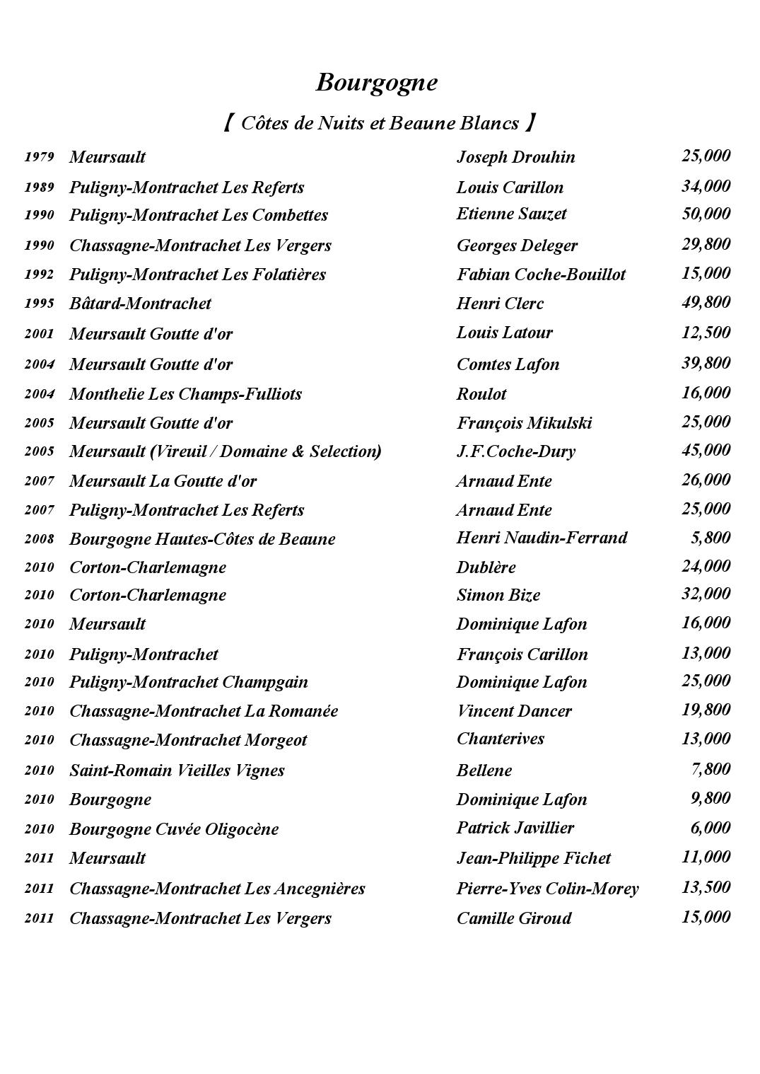 2009コート・ロティ/パトリック・ジャスマン¥17500 1979ムルソー/ジョセフ・ドルーアン¥25000 1990ピュリニー・モンラッシェ・レ・コンベット/エチエンヌ・ソゼ¥50000 2011シャブリ・ラ・フォレ/ヴァンサン・ドーヴィサ¥12000 2009リュリー・レ・サン・ジャック/A.&P.ドゥ・ヴィレーヌ¥9800