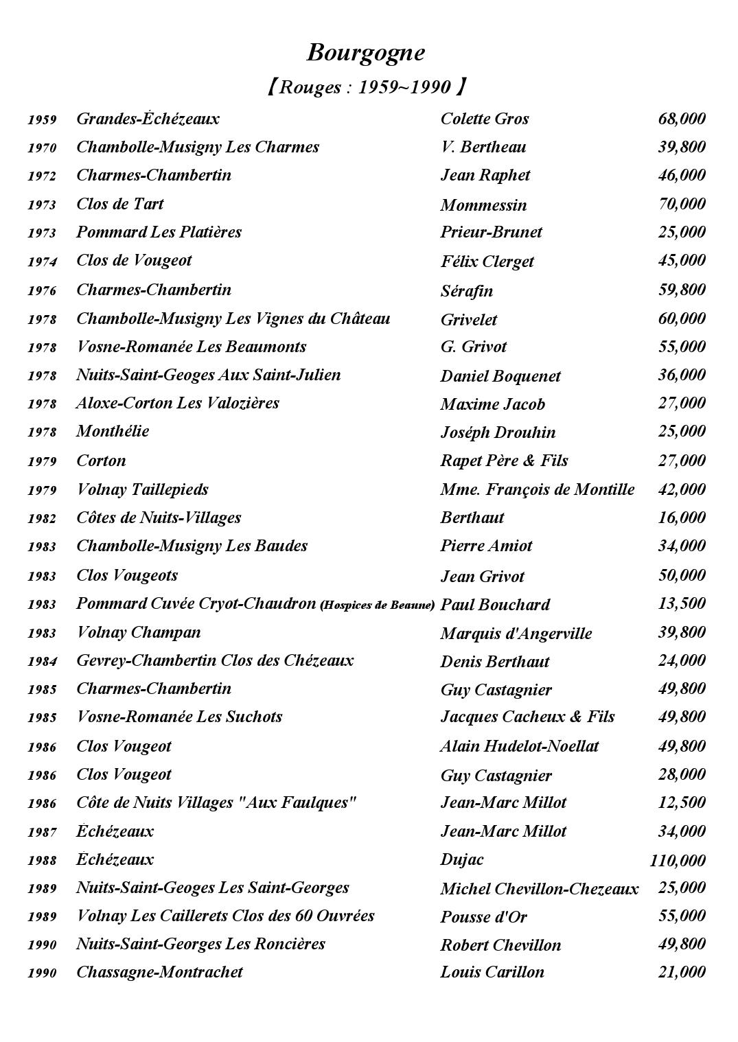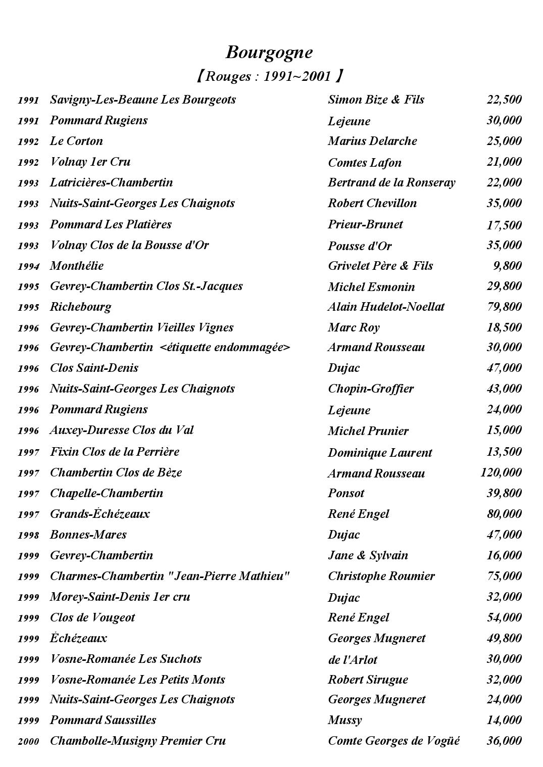 1993ヴォルネィ・クロ・ド・ラ・ブス・ドール/プス・ドール¥35000 1992ヴォルネィ・1級/コント・ラフォン¥21000 1989シャンボール・ミュジニー1級/ジョセフ・ドルーアン¥49800 1988クロ・ド・ラ・ロッシュ/ジャン・ラフェ¥42000