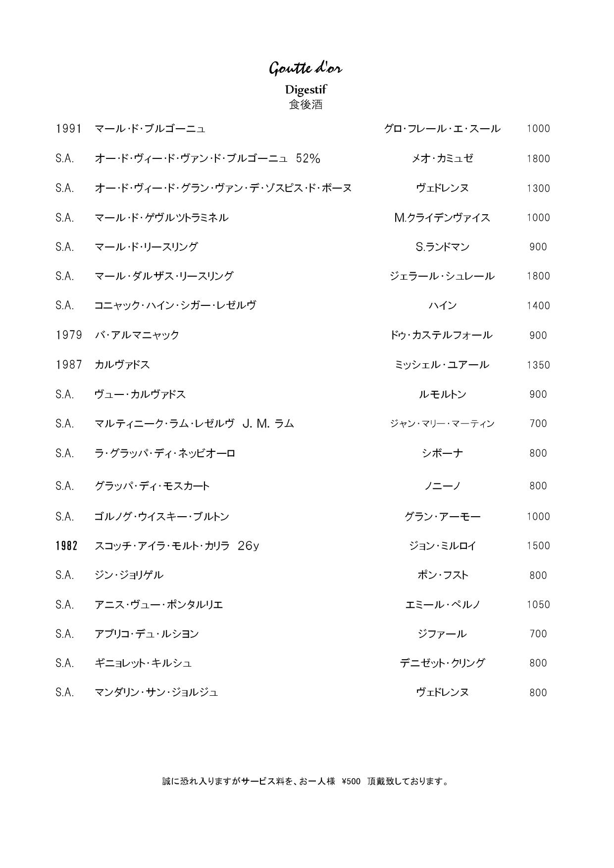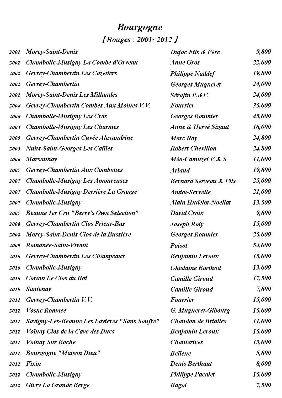 2006アグラパール&フィス ヴェニュス ¥30000 2005R&L ルグラ プレジダンス VV ¥18000 1978コルトン/パヴロ ¥45000 1982コート・ド・ニュイ・ヴィラージュ/ベルトー¥18800 1985シャルム・シャンベルタン/ギィ・カスタニエール¥54000 1990シャサーニュ・モンラッシェ・ルージュ/ルイ・カリヨン¥25000 1991サヴィニー・レ・ボーヌ・レ・ブルジョ/シモン・ビーズ¥24000 1999クロ・ド・ヴージョ/ルネ・アンジェル¥54000 1999エシェゾー/ジョルジュ・ミュニュレ¥54000 1999ヴォーヌ・ロマネ・レ・プティ・モン/ロベール・シリュグ¥34500 2000ヴォーヌ・ロマネ/フランソワ・フュイエ・¥13500 2007ニュイ・サン・ジョルジュ・レ・シェニョ/ミュニュレ・ジブール¥15000 2009ボーヌ・プルミエ・クリュ/BB&R(ダヴィ・クロワ) 2010サントネィ/カミーユ・ジルー¥8800 2011シャンボール・ミュジニー/フランソワ・ベルトー¥12000 2011ヴォルネィ・クロ・ド・ラ・カーヴ・デ・デュック/バンジャマン・ルルー¥15000 全て税込価格